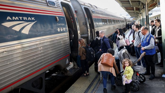 Amtrak broke ridership records with 34.5 million trips in fiscal 2025. The company is advising Americans to book promptly for Thanksgiving travel. (Kevin Dietsch/Getty Images)