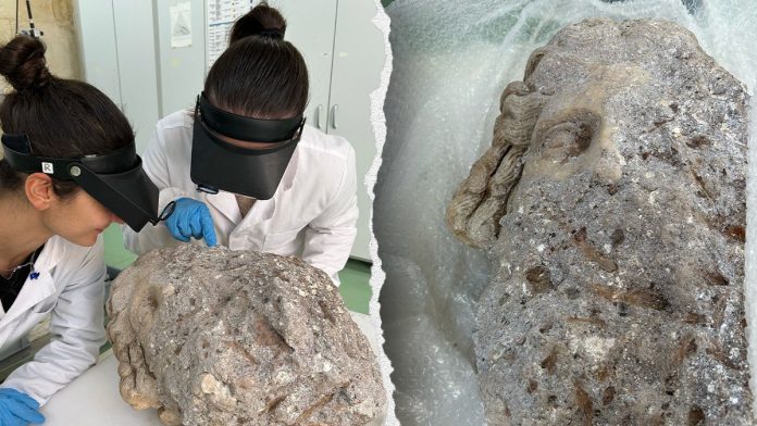 The stone head will be transferred to researchers in Matera, Italy, who will study and restore the artifact. (Parco Archeologico dell’Appia Antica via Facebook)
